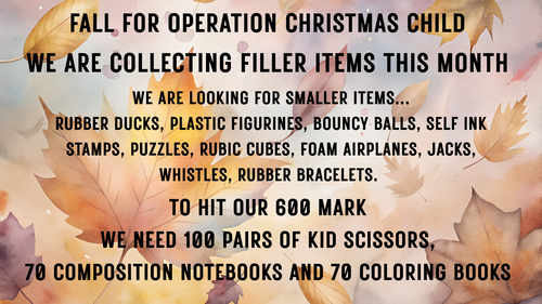 Donations for shipping boxes ($10 per box). Please add a note on the donation so we know these funds are to be designated to Operation Christmas Child.